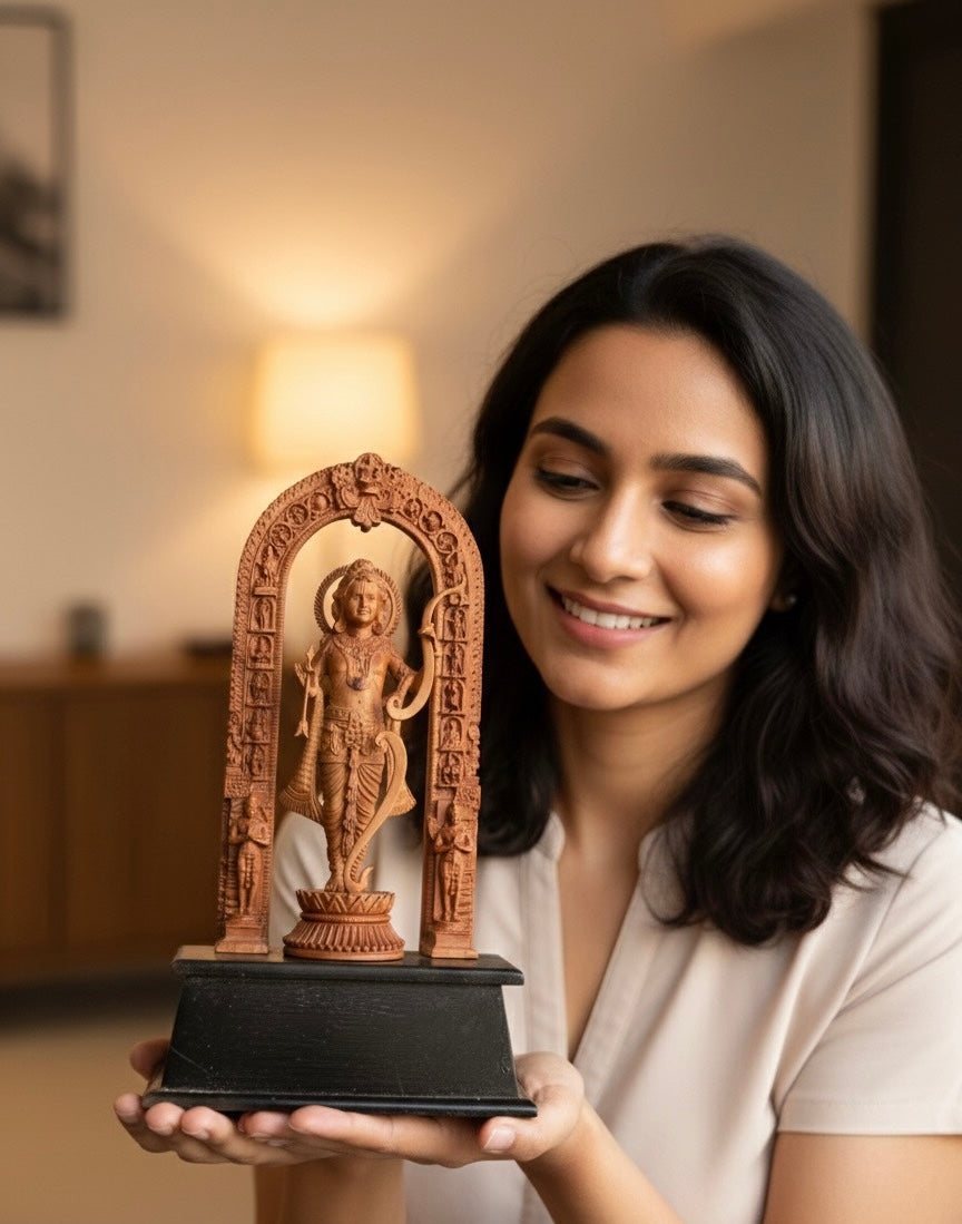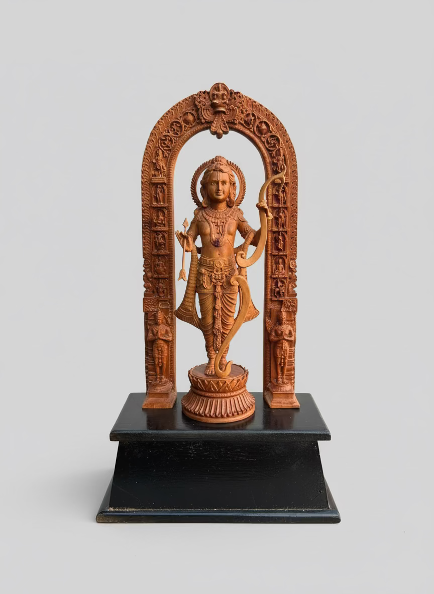 Beautifully hand-carved sandalwood Ram Lalla idol featuring a cute, detailed face inspired by the Ayodhya temple. The arch showcases Dasavatara carvings with Hanuman and Garuda on either side. Lord Rama stands with Dhanush on a lotus base, making this a divine and elegant décor or pooja piece.