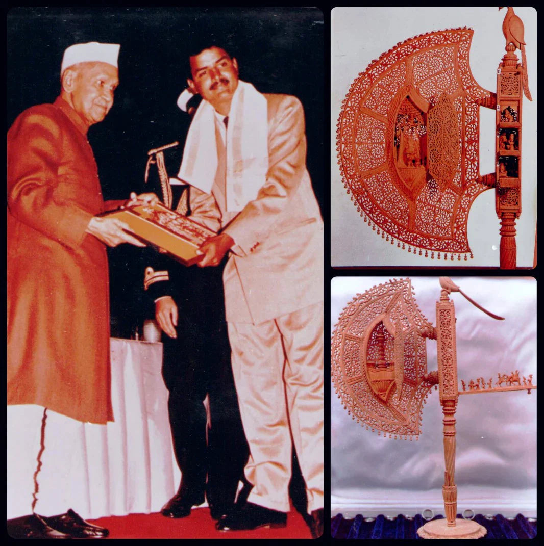 Malji then began crafting sandalwood products, which gained him recognition for his beautiful wooden artifacts of deities, decorative items, and other pieces. There was great demand for his work and pieces as his work became more and more well known. In 1971, Malji won the national award for a Rajasthani doll he handcrafted. Mohit also recounts an interesting story about Malji. Once, at a gathering in Sardarshahar town in Churu, he met Shubhkaran Nahta, a wealthy businessman. Impressed by Malji's craftsmanship, Nahta asked him to sell all of his pieces to him. Today, these and other objets d'art made by the Jangid family are housed in the Nahta Museum in Sardarshahr.